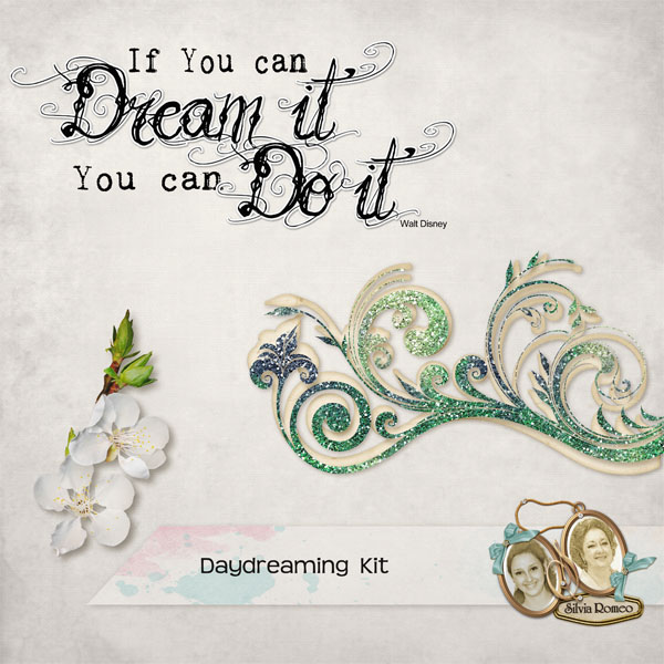 Daydreaming is an elegant kit, created in beautiful shades of blue and green, soft and versatile. Wonderful textures, cool elements, a touch of glam are all that is needed to complement your memories. Included are 18 papers and 47 unique elements such as brushworks, flowers, tags, word arts and many more! Enjoy!!!